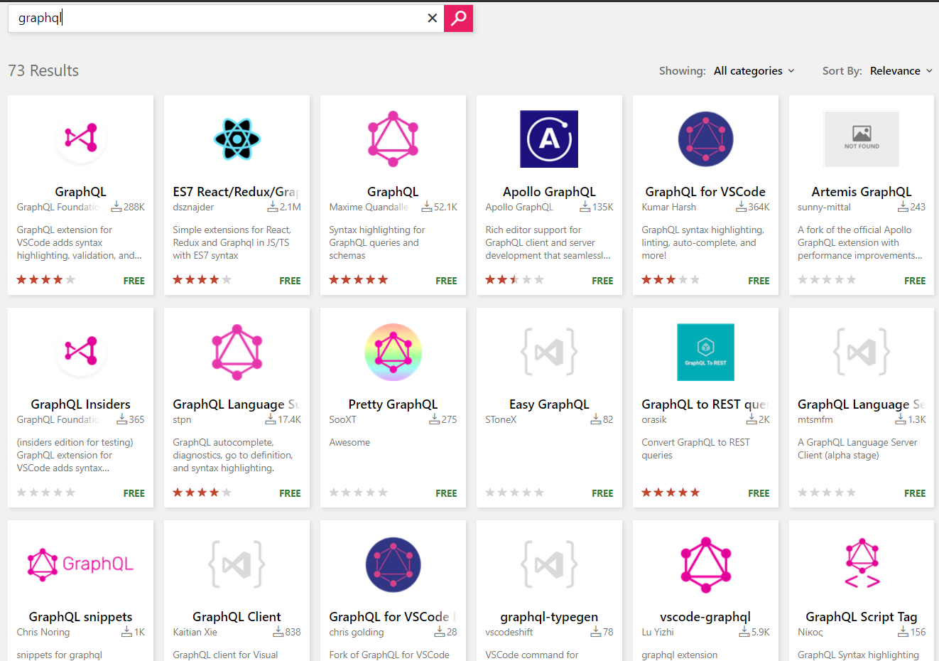 For instance, just do a search for “GraphQL” in the marketplace, and this is what you get: