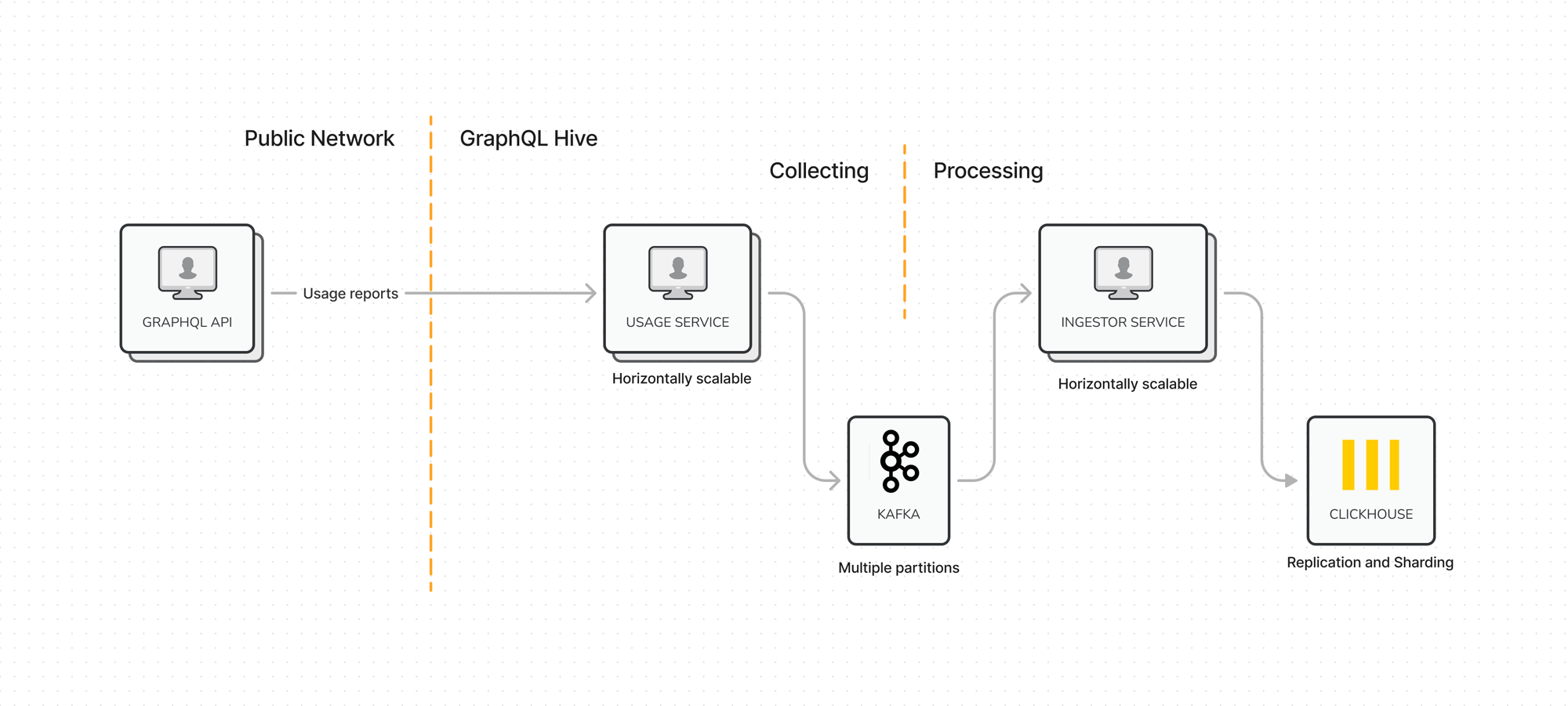 The data pipeline in GraphQL Hive is relatively simple but has proven to be highly scalable and reliable. Here's a high-level data flow of the usage reporting part of GraphQL Hive.