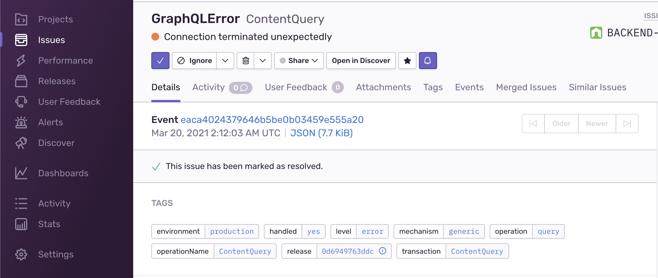 This is how it looks like in Sentry for error tracking:
